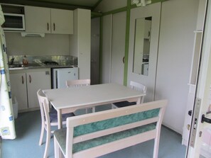 Camping des Etoiles - Chalets dispose de 2 chambres. Chaque chambre bénéficie d'une décoration et d'un ameublement personnalisés. Les chambres ont une cuisine avec un réfrigérateur, une plaque de cuisson et une batterie de cuisine, de la vaisselle et des ustensiles. Les salles de bain possÚdent une douche. Des lits bébé (gratuits) sont également disponibles.