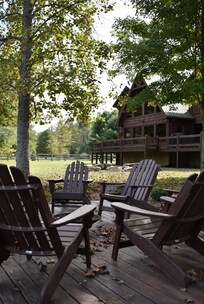 Outdoor - covered front porch, 2 rocking chairs, bench seating; main level covered screened in side deck, stacked stone wood burning fireplace, patio couch, 2 swivel patio chairs, coffee table, rug, ceiling fan; main level back deck, gas grill, 3 Adirondack chairs, side tables, hot tub seats 5; fire pit with large stones for seating; riverside deck, raised fire pit, 4 Adirondack chairs