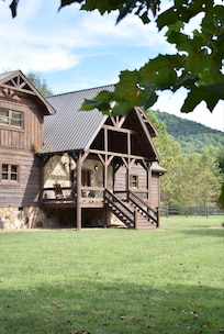 Outside, you'll find multiple gathering spaces that make the most of the natural setting. A screened-in side porch with a wood-burning fireplace offers a cozy, bug-free space to enjoy the fresh mountain air year-round. It's perfect for morning coffee, evening wine, or curling up with a good book by the fire.