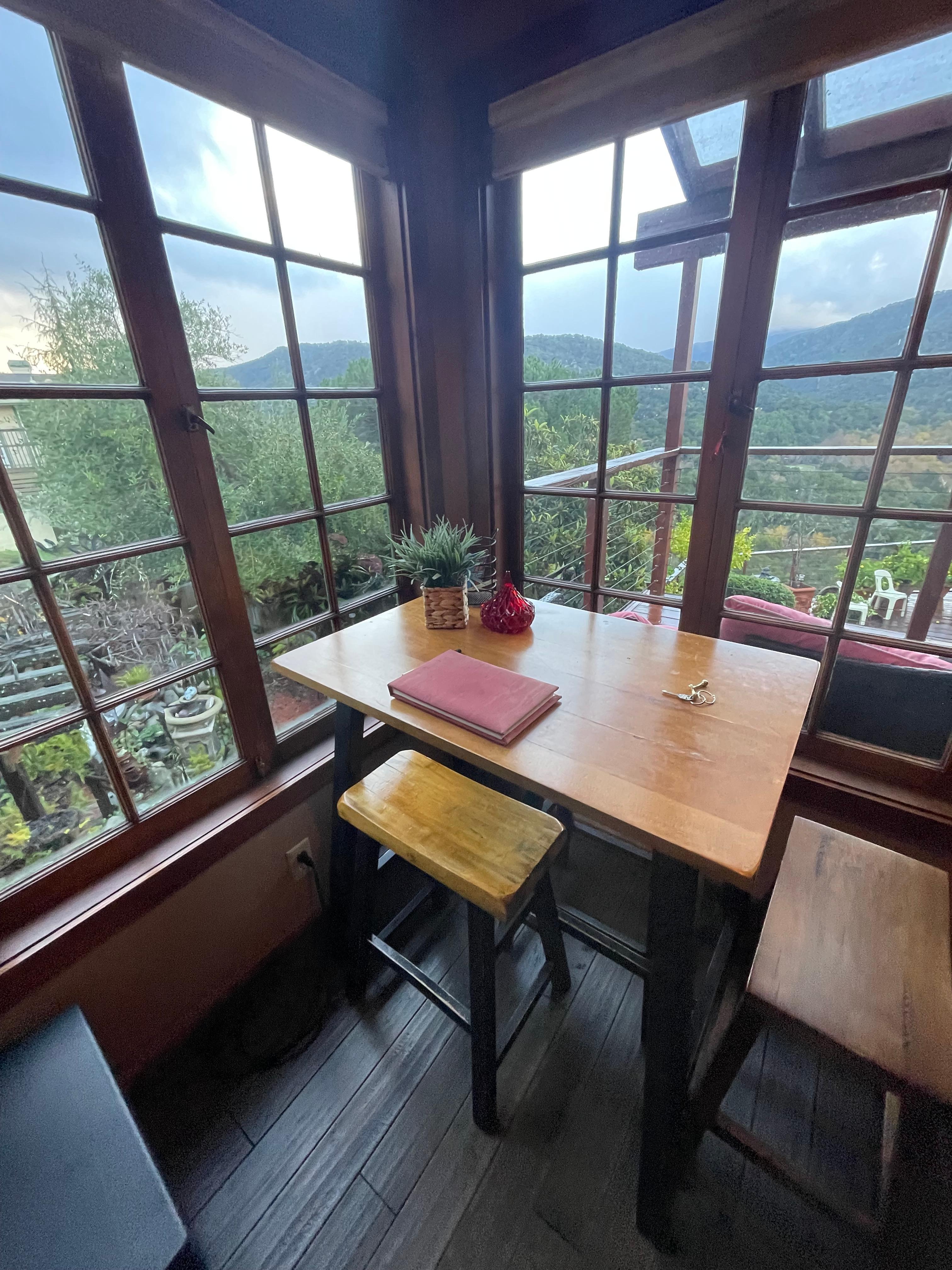 Up in the hills, gorgeous view of Carmel Valley and greenery from nearly every window. The studio does overlook the owner's backyard (which is spectacularly landscaped, replete with water features, vines, fruit trees and plants galore), though the owners seemed to stay out of sight. Only downside is the view of the neighbor's house, which demands the kitchen blinds remain closed to maintain privacy. The studio is charming, well decorated and has super soft sheets and a comfortable bed. The back patio is a glorious place to unwind, sip your beverage of choice and listen to the multitude of birds.