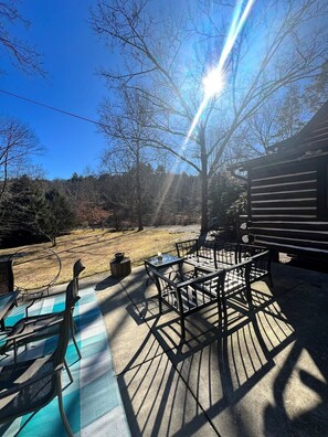 Profitez de la terrasse en bĂ©ton de 40 'sur le cĂŽtĂ© de la maison donnant sur la pelouse et le ruisseau œ acre! Parfait pour divertir avec un foyer extĂ©rieur au bois et un gril Ă gaz. SiĂšges pour 6 pour profiter de vos repas Ă l'extĂ©rieur.