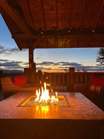 ⹠La terrasse et le patio offrent une vue imprenable sur les montagnes et comprennent de nombreux siÚges, des canapés en osier, un bain à remous, un foyer, un barbecue, un fumoir et une table de cheminée.