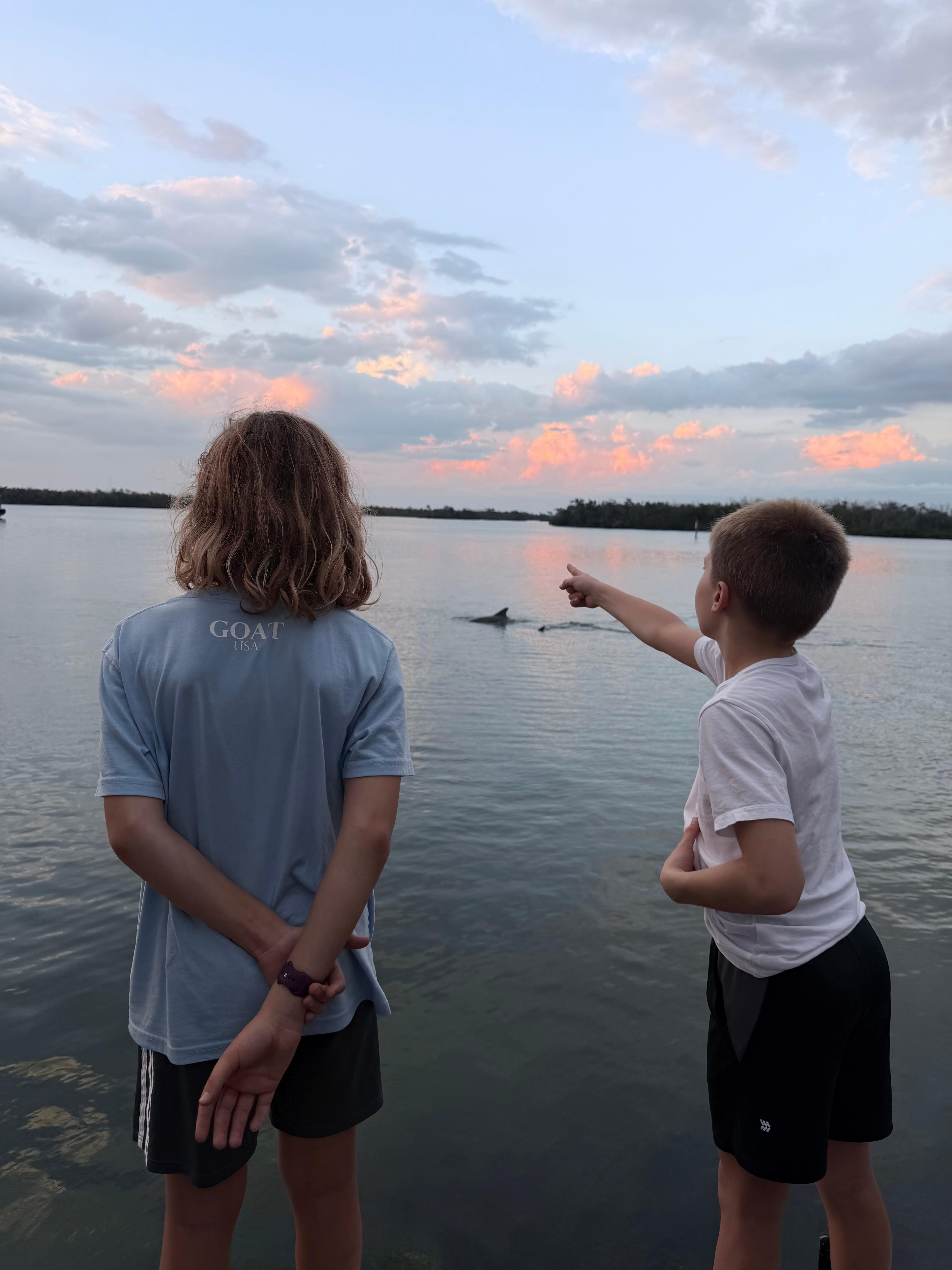 Dolphins swimming by at the end of the street.