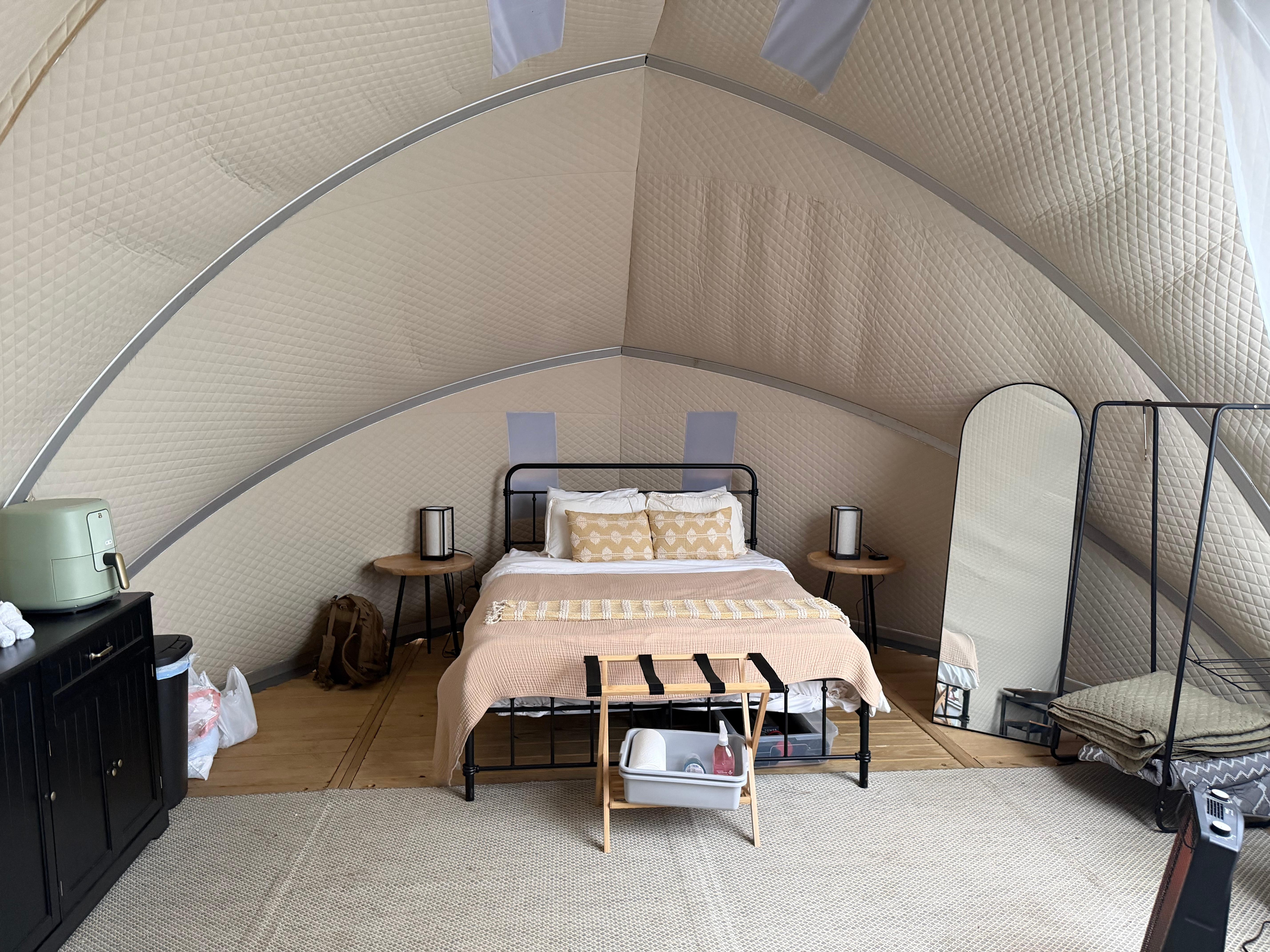 Inside the tent, you'll find a comfortable queen size bed, a mini fridge and kitchenette space, coffee maker, creating a cozy and welcoming space to unwind after a day of adventure. Whether you're traveling as a couple, with friends, or solo, this is a place to settle in, slow down, and truly reconnect.
