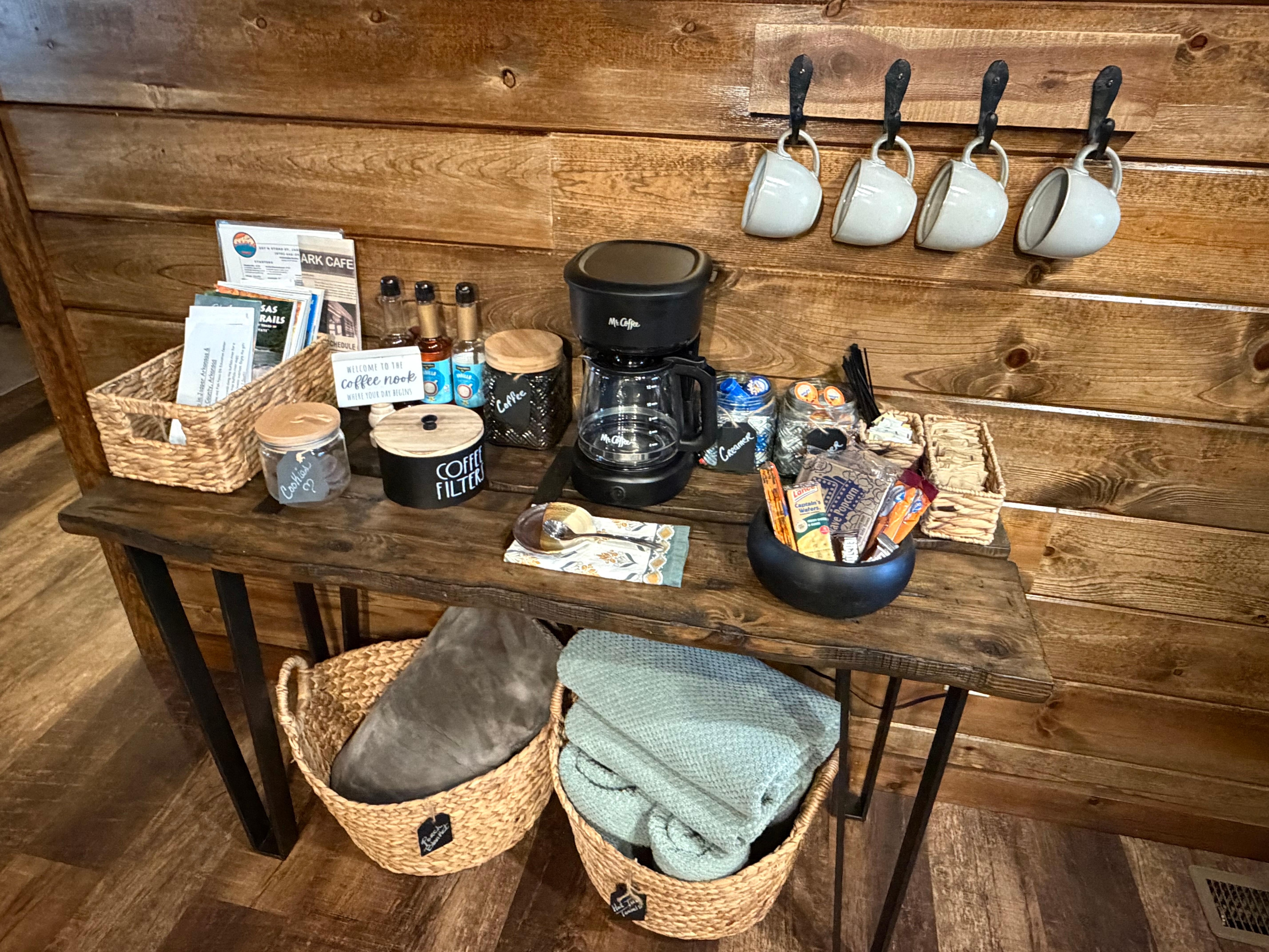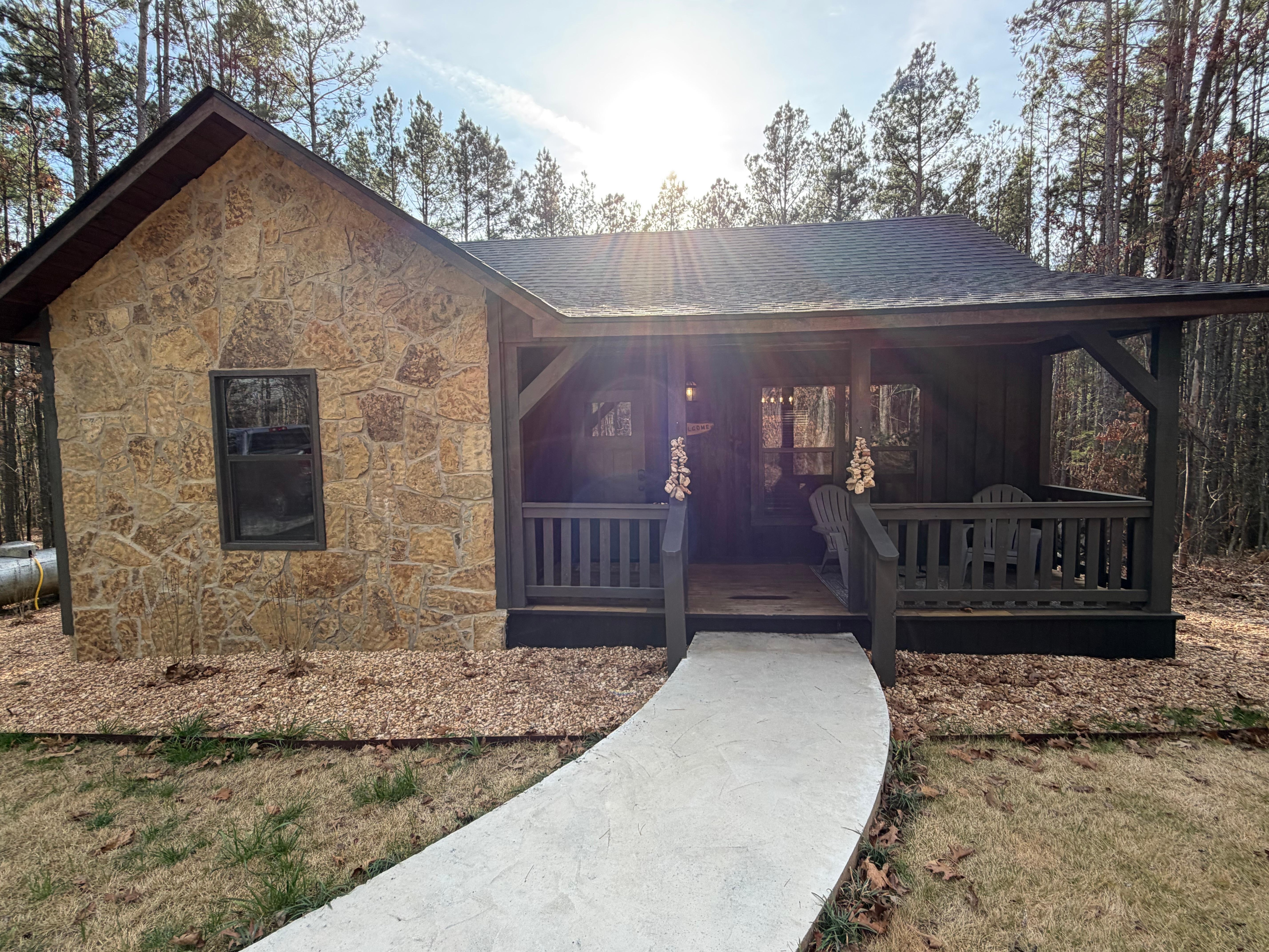 The host was the best ive ever had. She thought of everything. She had smores kits, candy, crackers, bottle waters, razors, brand new tooth brushes, cough drops, dental picks, even had feminine items. The cabin was very clean. Spotless honestly. Everything you would need to cook in the cabin. Wood pelet grill. Oven, microwave, brand new appliances. Glasses, plates, silverware, napkins,. She really put herslef in your shoes to try to have something for everyone. Firepace is on a timer, so you can enjoy an outside gas fire, without worring about putting it out. If you prefer a wood fire, she even has a place for that, with firewood nicely placed nearby. The hot tub easily accommodates 4 grown adults. Was very clean and sterilized. Plenty of towels for showers as well as extra towels for the hot tube nearby. Super soft blankets for outside as well. Now my absolute favorite part. The bedroom. One of the best beds ive ever slept in away from home. And i stay at 4 hotels a week so thats saying something. Lots of pillows a ceiling fan, lamps, etc. Cabin is brand new and they didn't cut corners building it. We will definitely be stayibg here everyrine we visit the arkansas grand canyon area. Dont take my word for it please go visit and see the southern hospitality for yourself, you wont be disappointed.