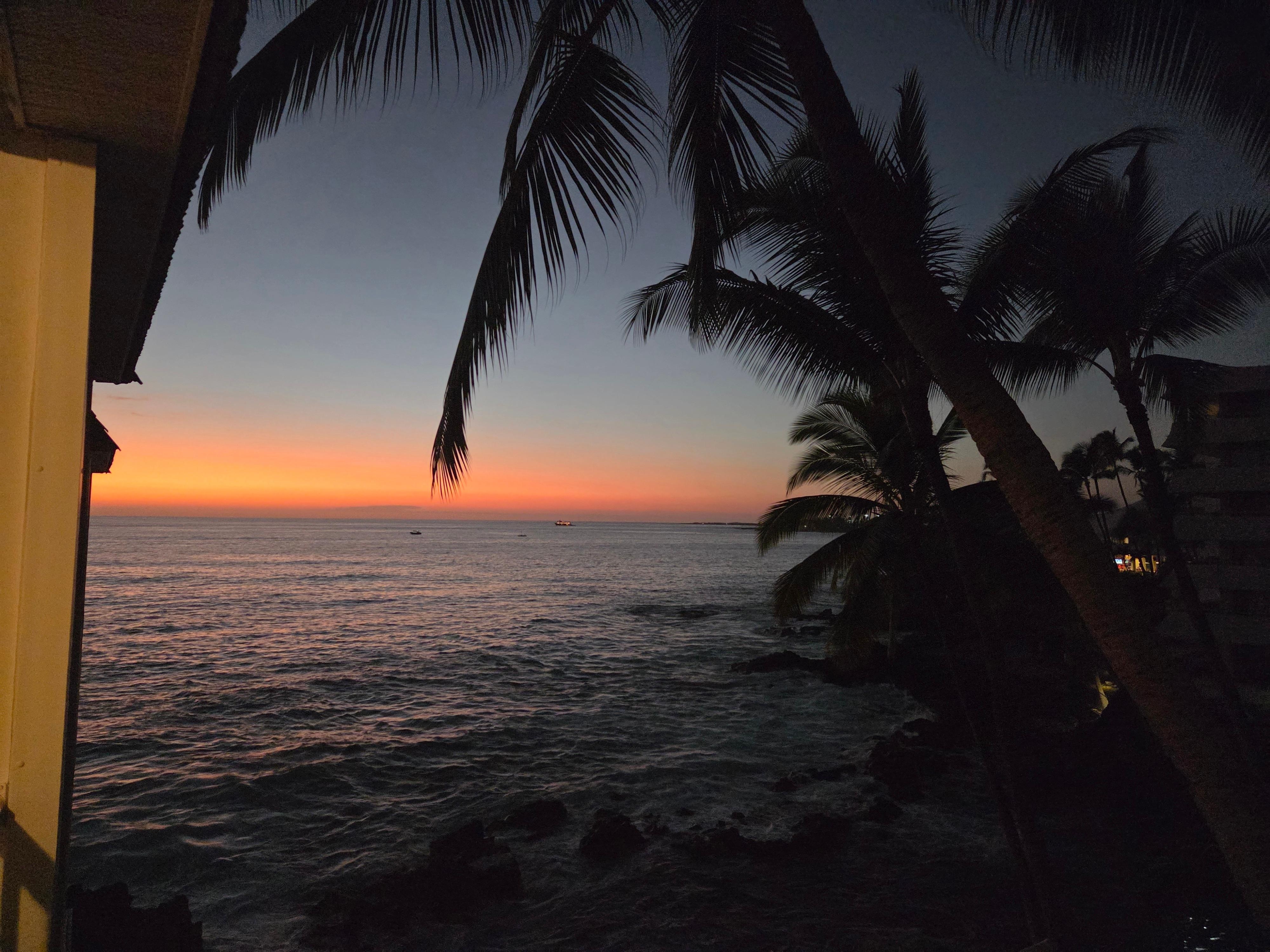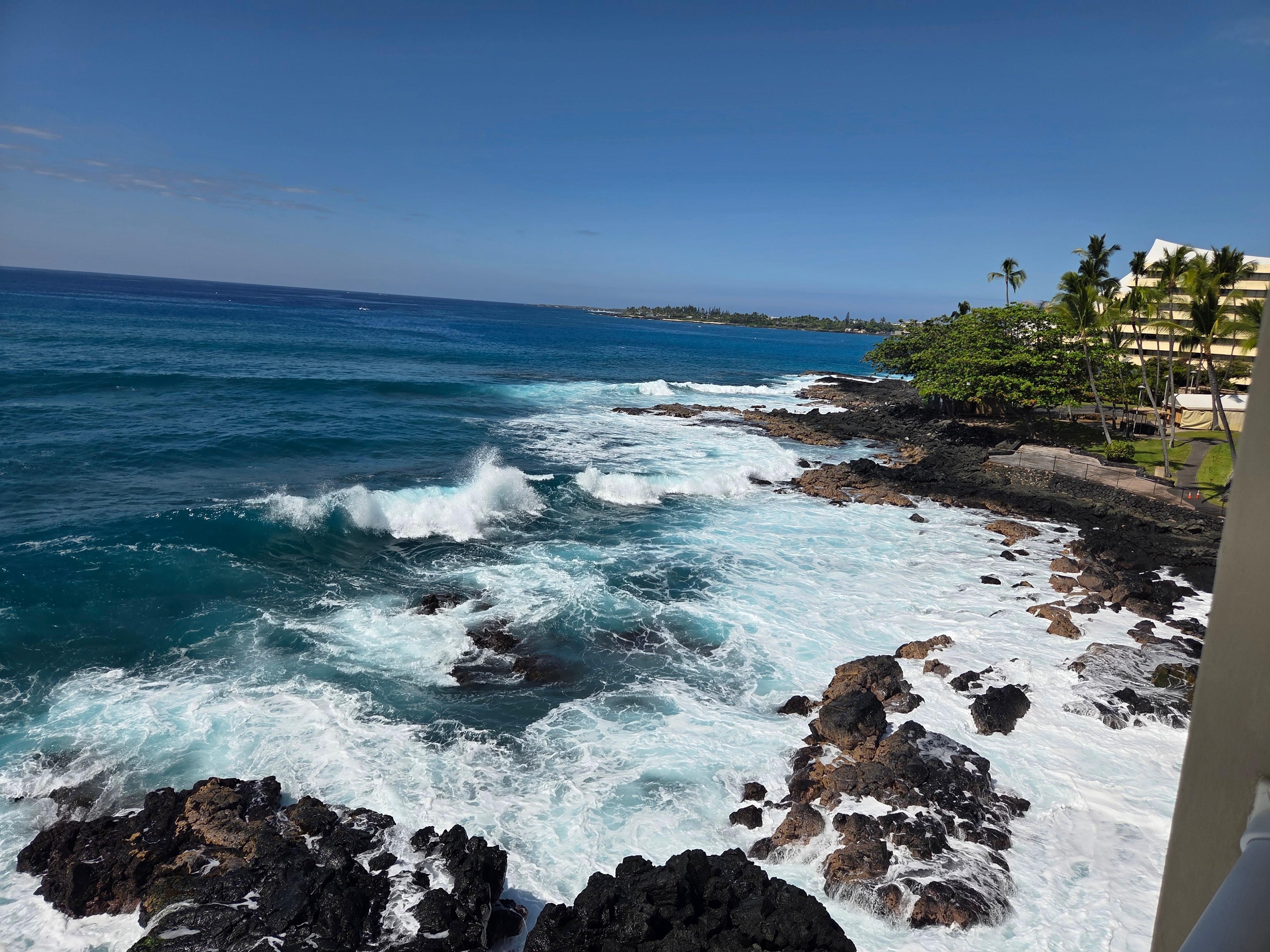 This oceanfront property offers a nice view of the ocean and of the beautifully landscaped grounds of the Royal Kona Resort next door. The ocean is teeming with life! Sit on your lanai and watch spinning dolphins year around and humpback breaching just offshore during the winter and spring months. Colorful reef fish, turtles and eels find plenty of sustenance in the tide pools. Wake up and fall asleep to the calming sound of the ocean.