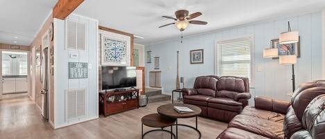 Living Area with Flat Screen TV with Roku, Dining Area, Kitchen, King Master Bedroom with TV with Roku, Bedroom with Double and TV with Roku, Bedroom with 2 Twins and TV with Roku, Full Bathroom.