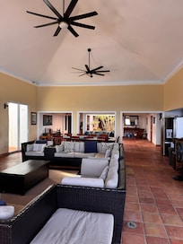 La grande salle spacieuse est la fierté de la villa, avec de hauts plafonds voûtés dans l'ancienne tradition de plantation qui couvrent l'immense espace commun avec des plafonds voûtés, un atrium intérieur rempli de plantations et, bien sûr, les vues les plus incroyables sur les Caraïbes. Les bibliothÚques sont entiÚrement approvisionnées avec une variété de lecture pour votre plaisir.