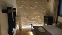 Chambre en bois ciselé: La chambre en bois ciselé a une saveur romantique qui vient avec la combinaison chaleureuse du bois, du cuir élégant et du laiton patiné. L'effet stupéfiant de ce que nous appelons la chambre à coucher en bois ciselé vient de son point culminant impressionnant - un grand mur en bois traité avec art au ciseau afin d'obtenir des irrégularités en bois sophistiquées renforcées par la lumiÚre verticale. La combinaison de rainures et de nuances apparemment accidentelles crée un décor rustique vraiment artistique et chaleureux. Sous le mur décoratif, se trouvent deux lits simples faits de cadres en laiton massif patiné et de cuir élégant. Des vases en céramique fabriqués à la main complÚtent l'image rustique de la chambre à coucher en bois ciselé. En savoir plus sur la chambre STONE et la chambre Shagal.