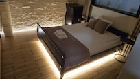 Salon: L'imagination de l'architecte Ă©tait Ă son comble ici! En entrant par le hall, le salon a une entrĂ©e de porte massive conçue pour ressembler Ă un cadre Ă©lĂ©gant d'une image rustique. Le mur dĂ©coratif de l'autre cĂŽtĂ© de la piĂšce prĂ©sente un design de brique inhabituel et crĂ©e ainsi une superbe image dans l'effet d'image. AdhĂ©rant au salon est une salle Ă manger et une cuisine oĂč la touche de style rustique a Ă©tĂ© obtenue avec une idĂ©e crĂ©ative de cuisine conçue pour ressembler Ă "Mur de Prusse" - de grosses bĂ»ches en bois en diagonale sur des meubles imitant une surface de mur brute naturelle crĂ©ent un effet Ă©tonnant. La salle Ă manger est faite Ă la main pour commander des lampes en cĂ©ramique suspendues au-dessus d'une belle table en chĂȘne. Se dĂ©coupant contre la cuisine Ă©lĂ©gante se trouve une belle fontaine et son eau gargouillante apaisante suintant d'une fissure de pierre brillante de deux mĂštres de haut et coulant lentement derriĂšre un grand arbre. ComplĂ©tant l'effet Ă couper le souffle de la splendeur avec la touche rustique est un ensemble de meubles en cuir chic.