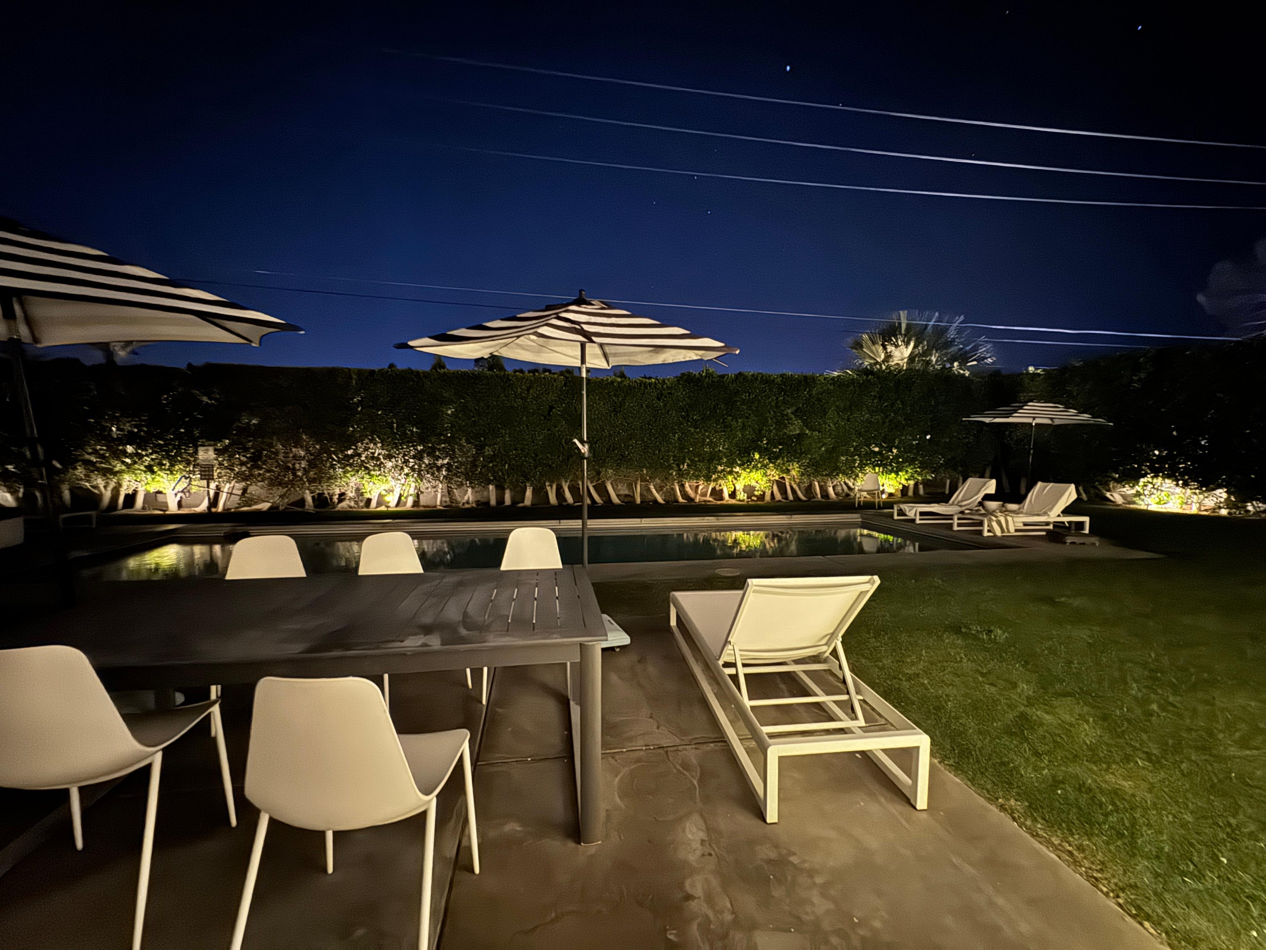 La grande cour permet une vie extĂ©rieure spectaculaire. Chaises et parasols complĂštent l'expĂ©rience de dĂ©tente au bord de la piscine. Un grand foyer est idĂ©al pour les nuits fraĂźches ou les soirĂ©es d'Ă©tĂ© romantiques en admirant le magnifique St. Vue sur la montagne Jacinto. Tout le monde peut profiter de la soirĂ©e ensemble. La piscine scintille et invite. Il est de taille gĂ©nĂ©reuse (environ) 43âx13 â.