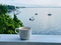 Not only charming but incredibly efficient, the kitchen is equipped with all the necessities needed to feed a family or group of friends. Make use of the refrigerator, microwave, and range with oven to create satisfying and delicious meals - all the pans are included, so you only need your grocery list and chef skills! The space is brightly lit by natural light, and the windows reveal even more inspiring views of the water and lush greenery.