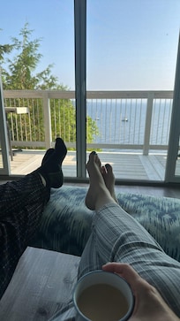 The Coastal Design unit in LoZa House is an intimate retreat thoughtfully designed over two levels to maximize the breathtaking views and the immersive lakeside experience. The ground floor hosts a light-filled bedroom and living area, ideal for unwinding after a day of adventure. The upper story is the heart of the home, featuring a spacious living room/dining area, a fully-equipped kitchen, and a bathroom, all adorned with chic coastal decor to complement the natural beauty of the surrounding landscape. The space is framed by a massive sliding glass door that offers sights and sounds of the peaceful lakefront with a remarkable panoramic view and access to an elevated deck. All windows facing our neighbors are covered with privacy film, so rest assured that your privacy is protected without sacrificing any of the unitâs marvelous views.