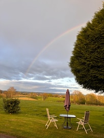 Outside, you have a garden area with table and chairs which is not fenced, and you are welcome to use the whole of our garden and the different seating areas. There is a charcoal BBQ for you to use. There are horses in the fields in front and to the back of us.