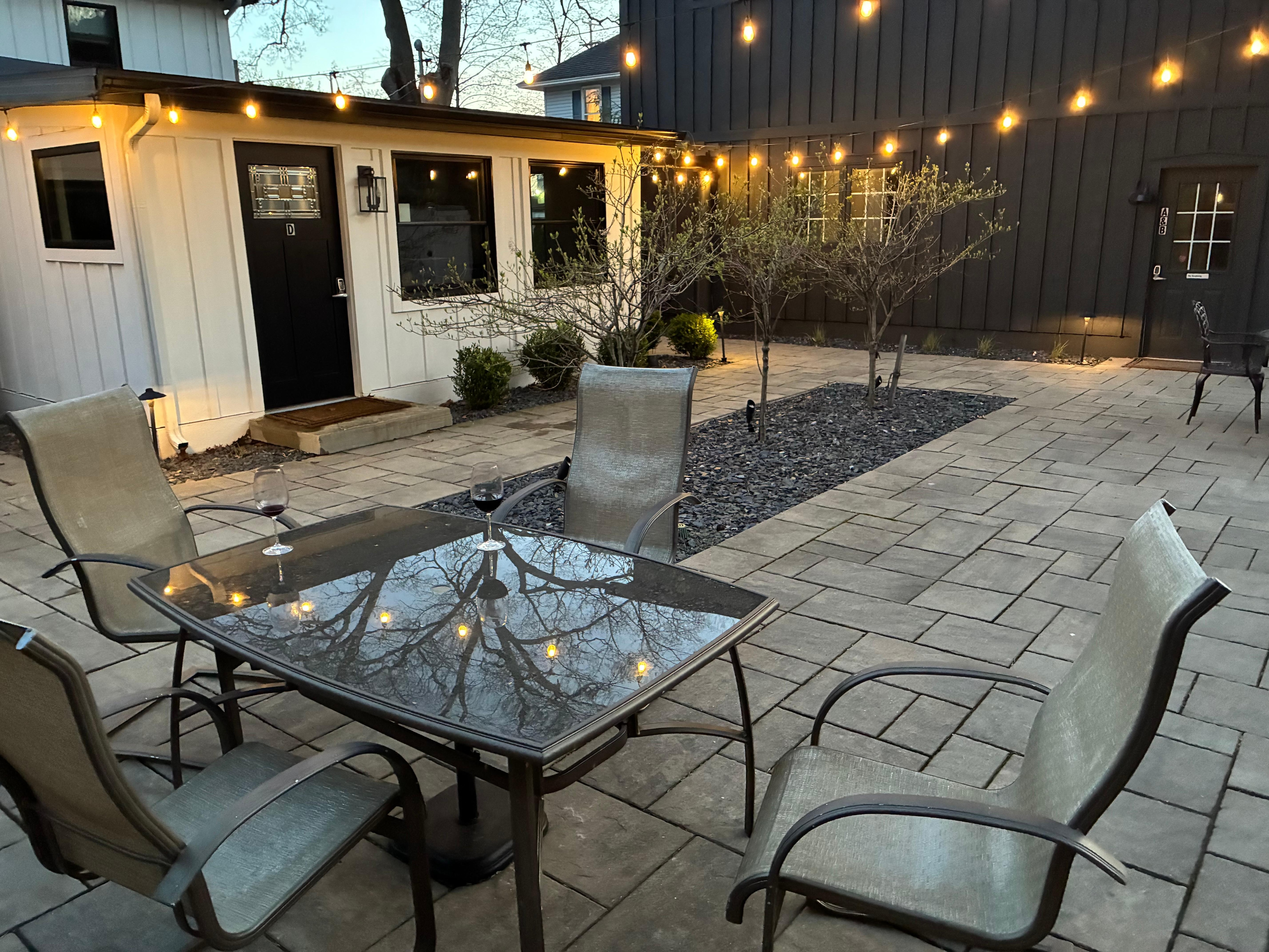 Behind the unit, find a private outdoor space complete with seating for outdoor dining and a gas grill.