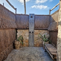 Cabane, salle de bains attenante, vue partielle sur la mer