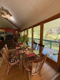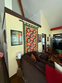 Nous offrons une maison spacieuse avec salle de bain privĂ©e, des Ćuvres d'art et des meubles originaux, de hauts plafonds, une cuisine avec des appareils en acier inoxydable Ă©coĂ©nergĂ©tiques, des comptoirs en granit et un dessus de bar en bois exotique, une cheminĂ©e Ă bois, une baignoire Ă jets privĂ©e dans la salle de bain principale, la tĂ©lĂ©vision par cĂąble et vidĂ©o, Internet sans fil Wi-Fi et un grand Lanai enveloppant de 1000 pieds.